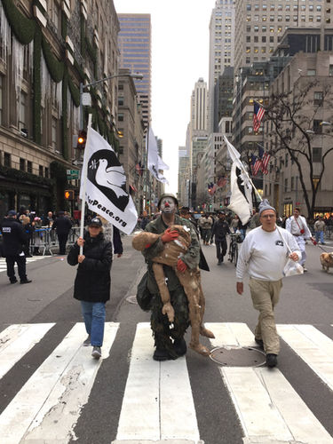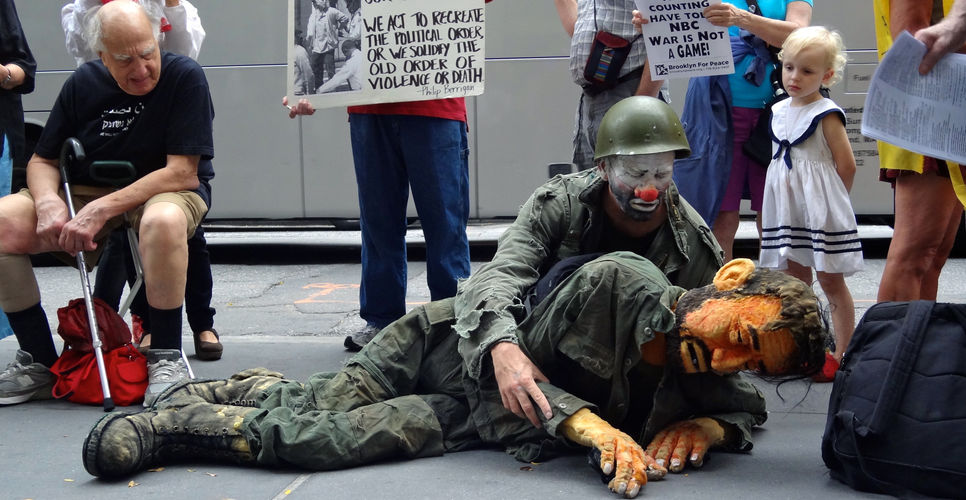 A roving street series about the true costs of war. Engaging with random spectators on city sidewalks, in public parks, along parade marches and on military bases, this silent pantomime is performed without polemical bombast, sharing the simple message: peace is possible, we just have to choose it.